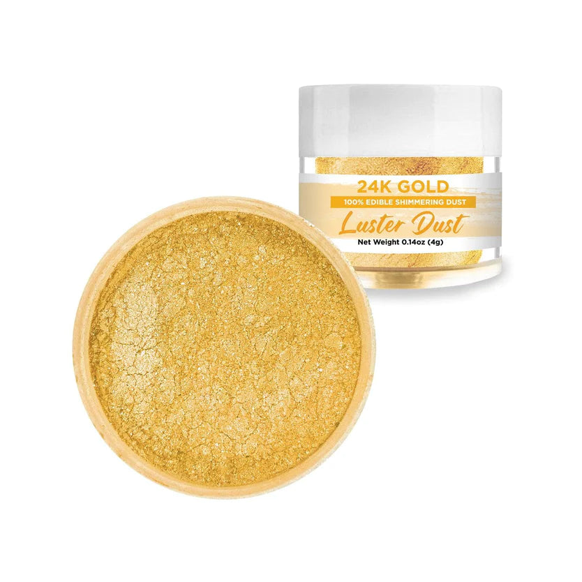 - The Bakell 24K Gold Luster Dust is a beautiful water-soluble colored powder with brilliant pearlized tones that can be applied either as a dry powder, or mixed with lemon extract, vodka, alcohol, water, etc and then applied to your confectionery masterpiece as a brilliant, edible paint! Different than its sister powdery-glitter, Tinker Dust edible glitter, Luster Dust can be applied dry or wet with amazing results.Â