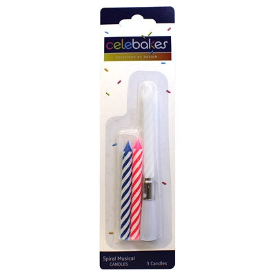 • Celebakes Musical Candle brings whimsy and fun to your birthday cake. With a simple twist, the cake topper will play "Happy Birthday".  Each package includes three candles: pink, white, and blue along with the musical base.