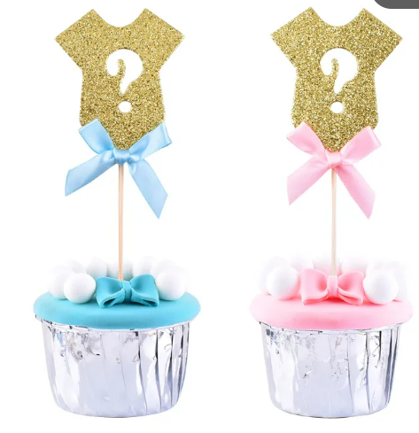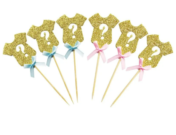 Decorate your gender reveal treats with our Gold Onesie Cupcake Picks. Each set includes 12 picks: 6 with a pink ribbon and 6 with a blue ribbon. These fun decorations will add a touch of charm to your gender reveal celebration.