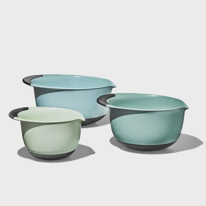The OXO Good Grips 3-Piece Mixing Bowl Set helps you tackle any culinary project, from whisking eggs to mixing cupcake batter to making marinade. The 1.5-quart, 3-quart and 5-quart Bowls feature soft, non-slip handles. Non-skid bottoms stabilize the Bowls on any kitchen surface, even at an angle. Wide lips and spouts make pouring ingredients easier than ever. Plus, the Mixing Bowls nest neatly for convenient storage. BPA free and dishwasher safe.