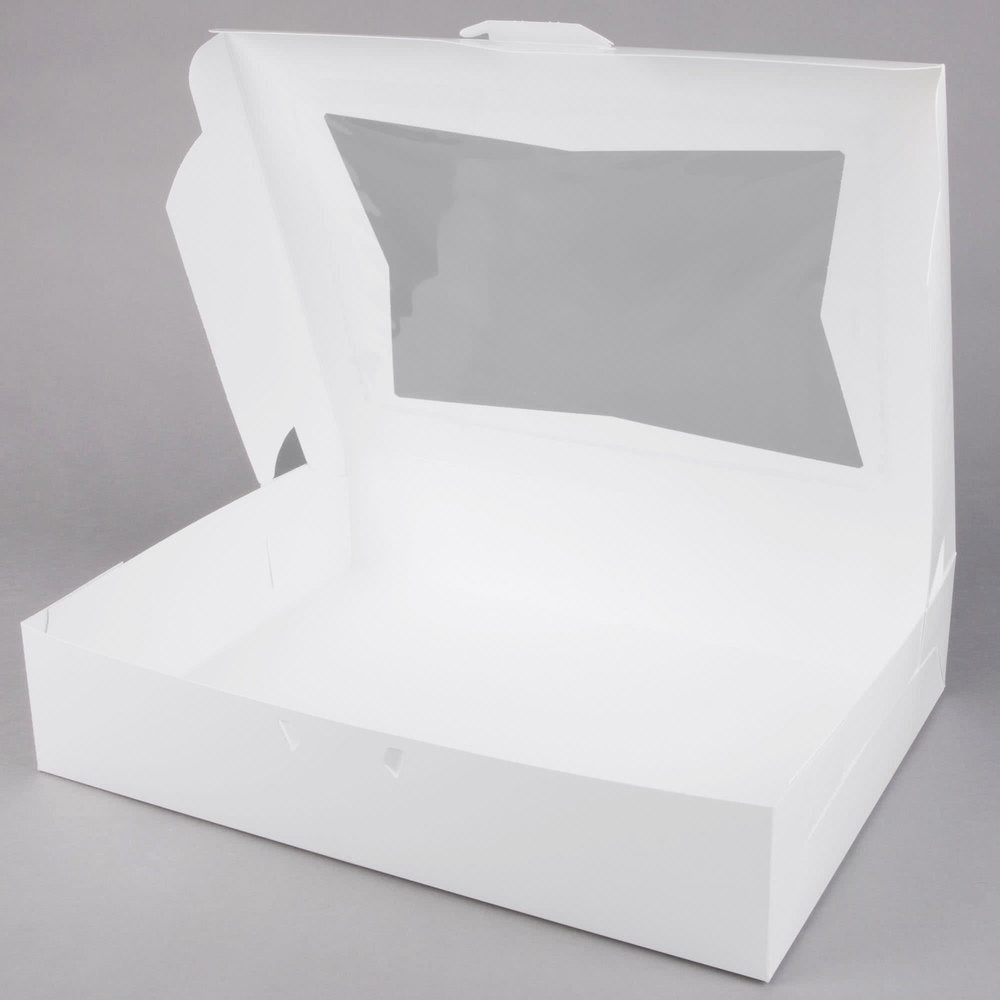 • This white bakery box will add a professional touch and look to your cakes, cupcakes and other treats.  This one-piece pastry box is super-easy to assemble.  Just fold and insert the corner tabs.  The box closes at the top with a simple tuck-in tab.