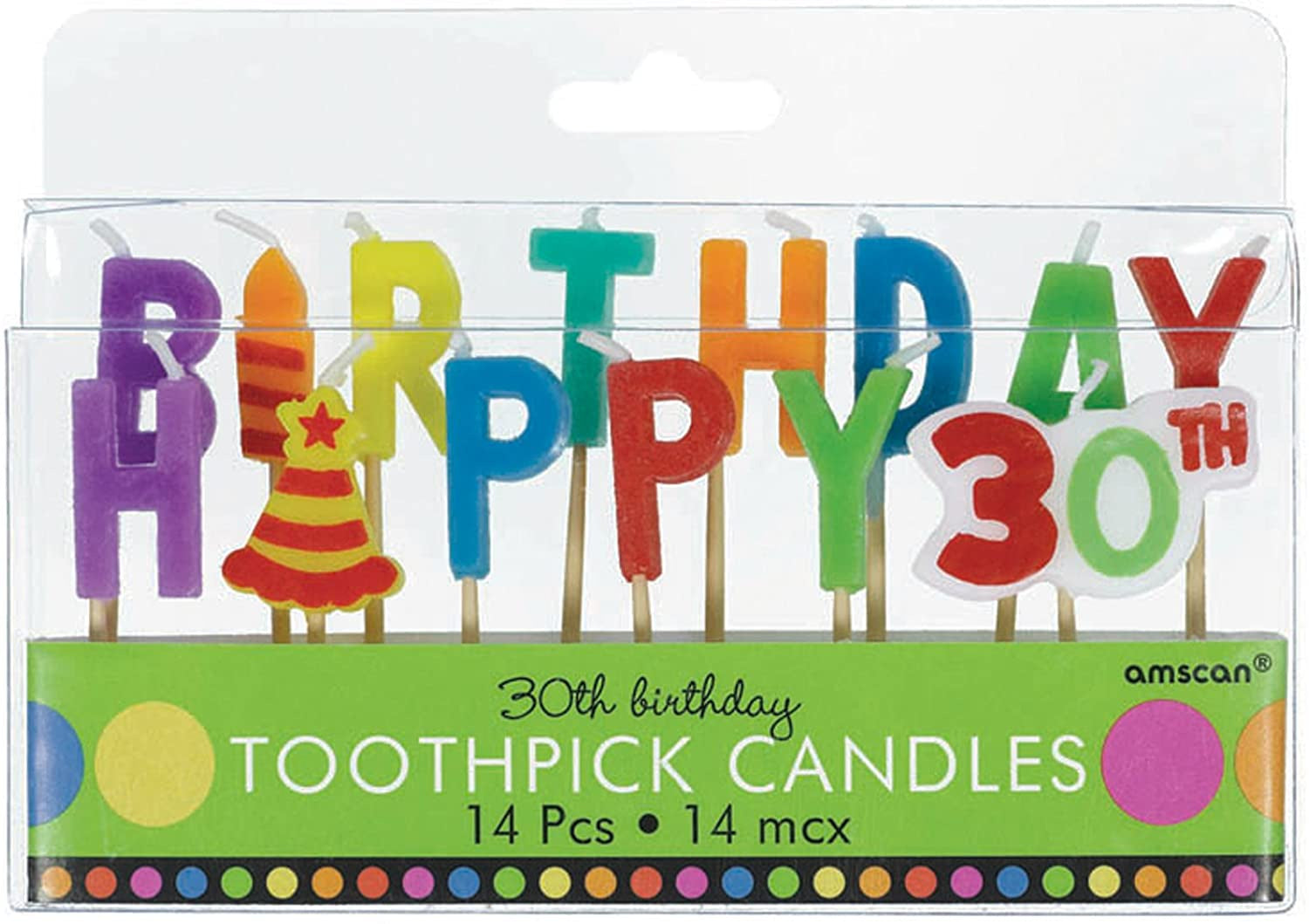 Celebrate a milestone 30th birthday with these multi-colored toothpick candles spelling out "Happy 30th Birthday". Each letter is attached to a convenient sturdy toothpick base that make them perfect for decorating cakes, cupcakes, and cookies. This set features purple, blue, red, green, yellow, orange, and teal letters and the 'A' in "Happy" is a birthday party hat. Â