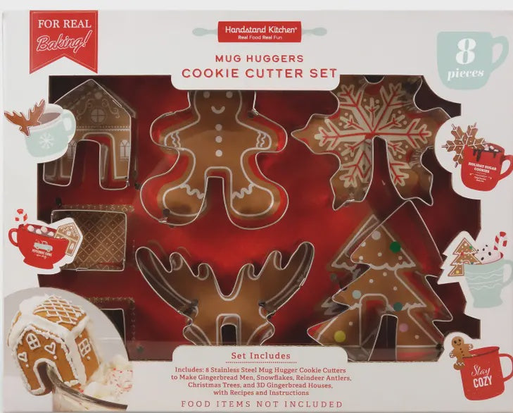 Mug hugger cookies are fun to decorate and ready to dunk in your hot cocoa, eggnog, or coffee drinks! Includes: 7 stainless steel mug hugger cookie cutters to make gingerbread men, snowflakes, reindeer antlers, christmas trees, and 3D gingerbread houses, with recipes and instructions. Recipes include: festive gingerbread mug hugger cookies and royal icing.