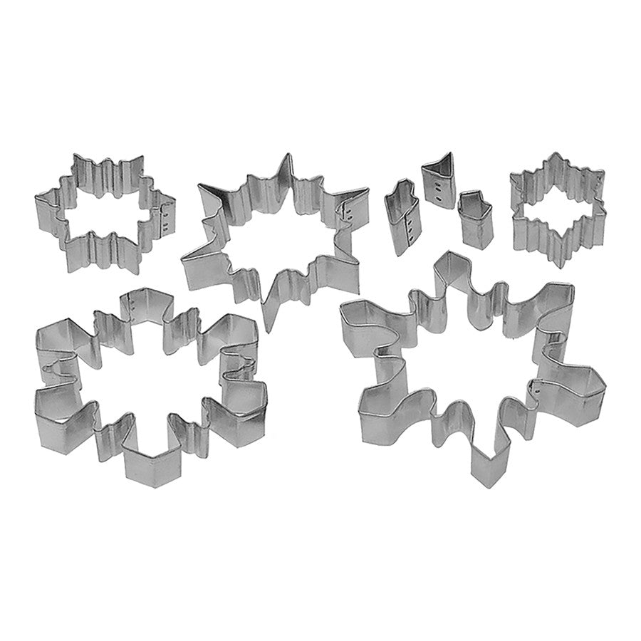 - This 8-piece set is made of high-quality tinplated steel. Sizes include 5.75″, 5.5″, 3.75″, 2.75″, 2″ and 3 decorative-pieces to create intricate snowflake cut outs.